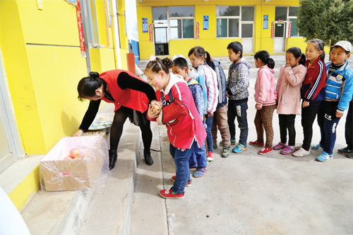 4月12日,在靜樂縣神峪溝鄉(xiāng)張貴村小學,該校學生正在領(lǐng)取免費營養(yǎng)餐。張貴村小學是該縣實施國家農(nóng)村義務(wù)教育階段學生營養(yǎng)改善計劃的學校之一,按照每生每天4元的補助標準,該校每年有4萬余元用于學生加餐補助。(閆曉梅 攝)