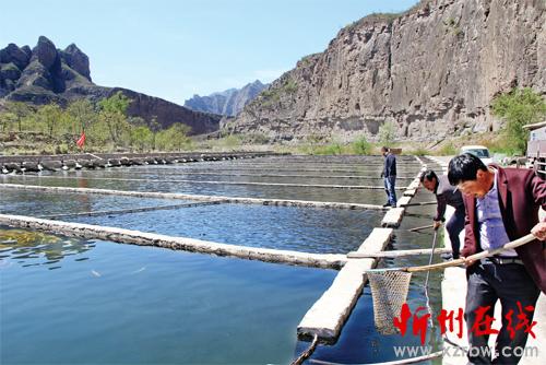 素有“江南水鄉(xiāng)”美稱的五臺(tái)縣陳家莊鄉(xiāng),是一個(gè)海拔只有640 米的秀美山鄉(xiāng),在五臺(tái)農(nóng)村商業(yè)銀行“金融扶貧”、“水產(chǎn)信貸”等專項(xiàng)貸款的大力扶持下,鄉(xiāng)黨委、鄉(xiāng)政府圍繞得天獨(dú)厚的泉水資源, 號(hào)召農(nóng)民發(fā)展水產(chǎn)養(yǎng)殖業(yè)。村民們先后建成5 個(gè)露天養(yǎng)魚場(chǎng),投放名貴紅鱒魚苗150 萬(wàn)尾,今年產(chǎn)量可望達(dá)到1.3 萬(wàn)公斤,以每公斤68元的價(jià)格遠(yuǎn)銷北京、西安,近銷太原、忻州、五臺(tái)山,年收入可達(dá)88 萬(wàn)元。圖為村民們?cè)谏饺B(yǎng)魚池?fù)启~。(金俊賢 鄭光 攝影報(bào)道)
