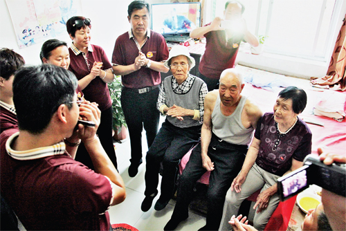 7月2日,原平市新原鄉(xiāng)集中供養(yǎng)敬老院里歌聲飛揚,原平佳藝藝術(shù)團和口琴聯(lián)盟會給這里的老人們送上了一道文化大餐。原平市加強養(yǎng)老服務(wù),在各鄉(xiāng)鎮(zhèn)建設(shè)養(yǎng)老院,使老年人老有所依、老有所養(yǎng),社會團體和群眾藝術(shù)團經(jīng)常送文化、送藝術(shù)到養(yǎng)老院,豐富了老人們的文化生活。圖為志愿者為老人獻唱。(吉建平 攝)