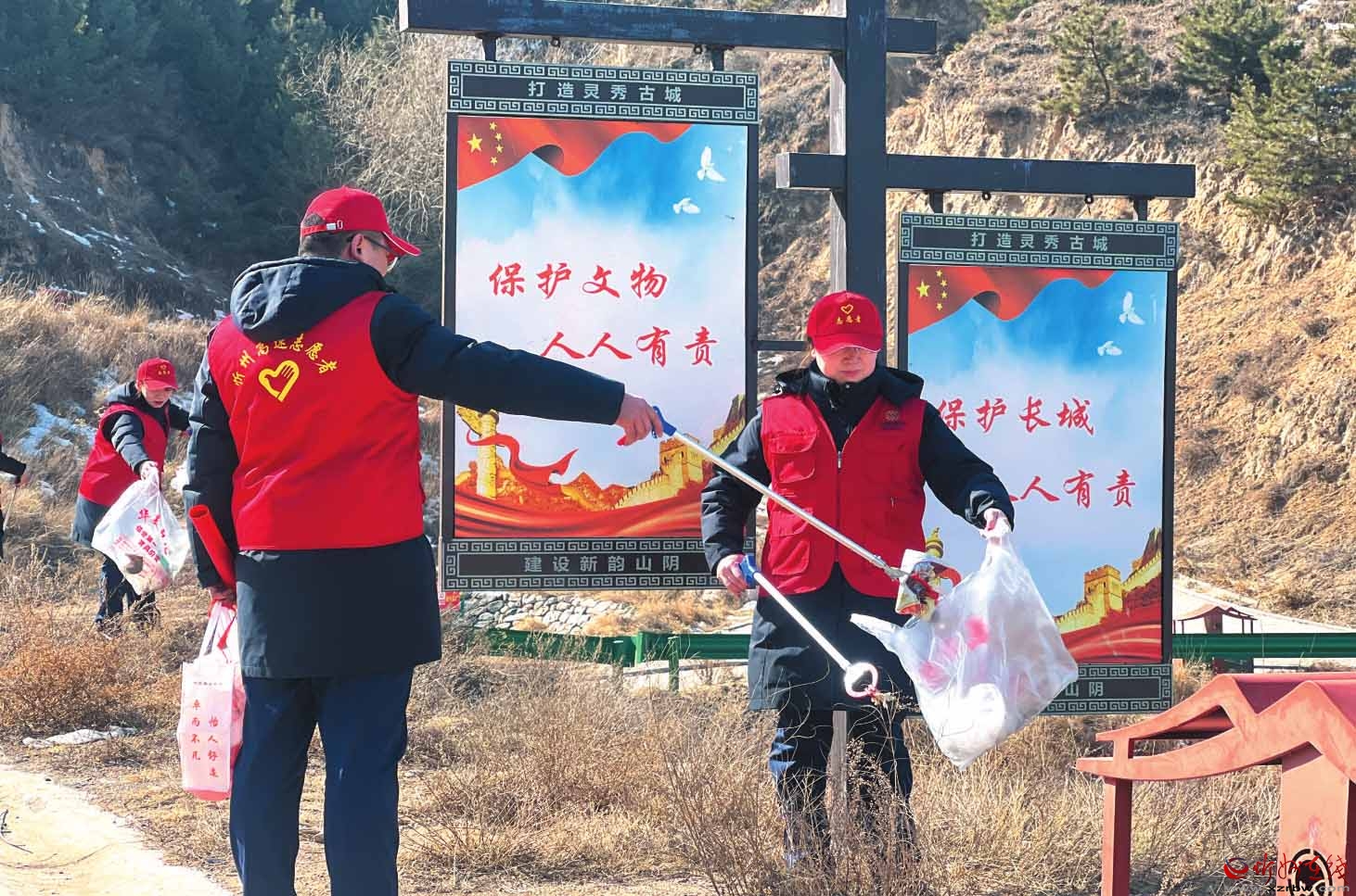 近日,山西交控忻州公司新廣武收費(fèi)站的志愿者身著醒目的紅馬甲,來到廣武明長城開展志愿服務(wù)活動(dòng)。圖為志愿者手持夾子等工具,認(rèn)真撿拾垃圾。 (曹慧敏 劉曉榮 攝影報(bào)道)