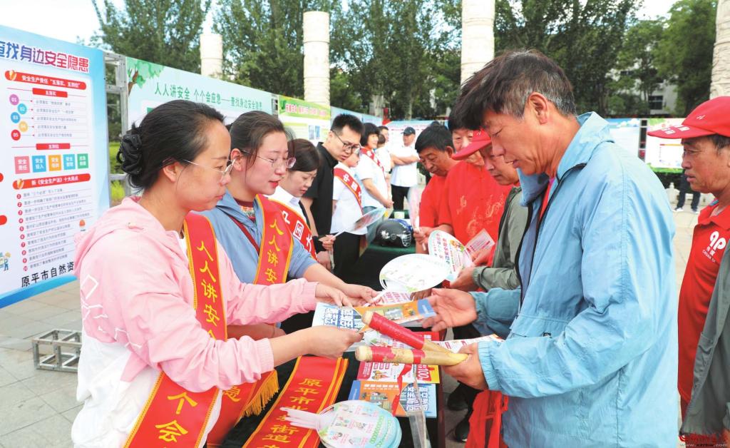 6月16日,在原平市范亭文體廣場,工作人員正在向市民發(fā)放安全生產(chǎn)知識宣傳手冊。據(jù)悉,今年6月是第24個全國“安全生產(chǎn)月”。為弘揚安全發(fā)展理念,提升公眾安全意識,該市組織消防、應急保障、公安交警等部門,聯(lián)合開展了以“人人講安全、個個會應急——查找身邊安全隱患”為主題的“安全生產(chǎn)月”現(xiàn)場安全咨詢和教育體驗活動?;顒又校行麄靼踩a(chǎn)政策法規(guī)、應急避險和自救互救方法等,以提升全民應急素養(yǎng)。(褚震攝)
