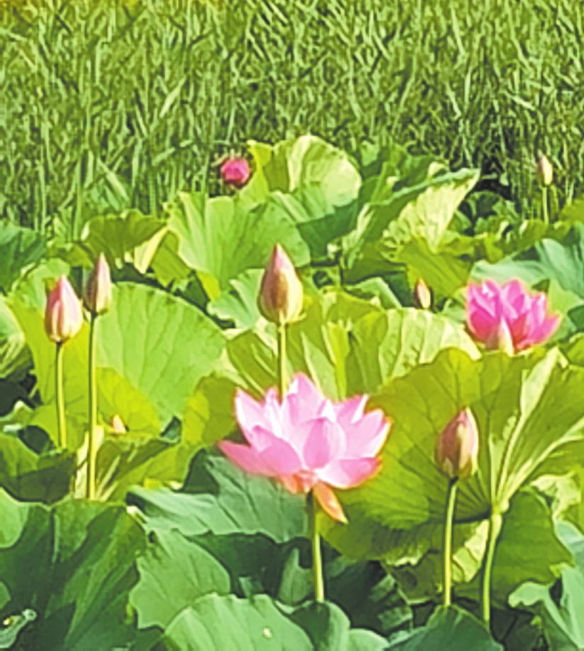 日頭爬高些,荷香便成了游走的信差。它鉆進(jìn)小橋的縫隙,沾了點(diǎn)煙火氣;繞著岸邊的樹枝打旋兒,裹了絲蟬鳴;最后停在賞荷人的面前,令人心醉。