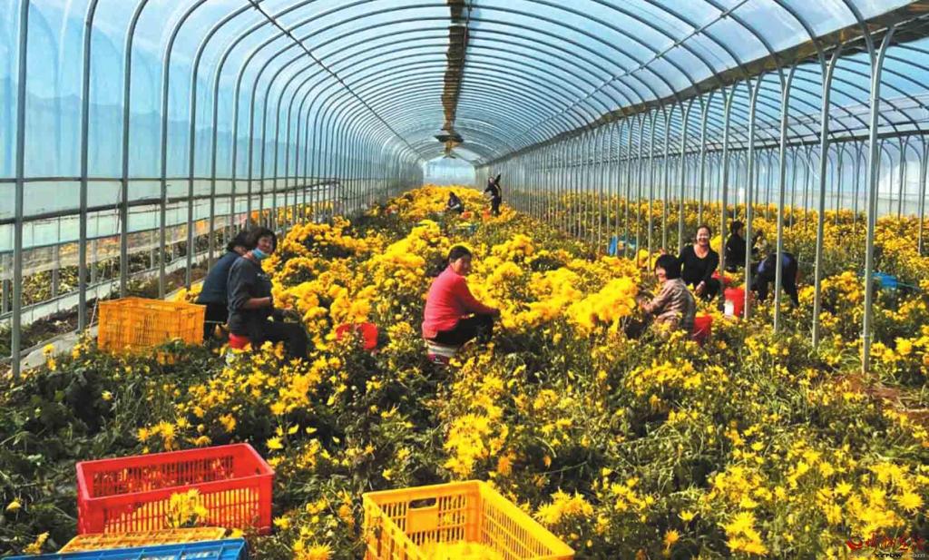 “你看這花,今年長得比去年還壯實?!闭诓烧墓と藙⒂⑿χe起一朵金絲菊,花瓣上還沾著清晨的露水,“我家就在附近村,自從基地建起來,我農(nóng)閑時就來干活,既能照顧家里,一天還能掙100元,比外出打工舒心多了。”說話間,她又彎腰采下一朵,小心翼翼地放進筐子中,“這花金貴,下手得輕,不然花瓣掉了就賣不上好價錢?!?/p>