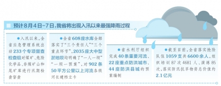 據(jù)氣象部門報告,預(yù)計8月4日-7日,我省將出現(xiàn)入汛以來最強(qiáng)降雨過程。為做好此次強(qiáng)降雨防范應(yīng)對,8月3日下午,省防汛抗旱指揮部組織了緊急會商,進(jìn)一步強(qiáng)弱項、補(bǔ)短板,全力做好各項工作,確保安全度汛。