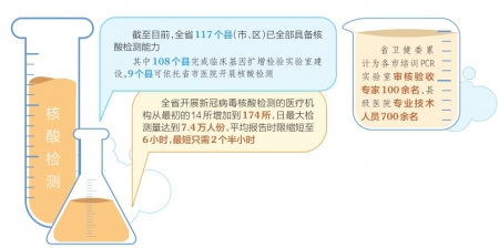 利用核酸檢測開展大范圍篩查,是精準(zhǔn)防控疫情的有效手段。省衛(wèi)健委醫(yī)政醫(yī)管局四級調(diào)研員趙宏介紹,全省開展新冠病毒核酸檢測的醫(yī)療機(jī)構(gòu)從最初的14所增加到174所,日最大檢測量達(dá)到7.4萬人份,平均報告時限縮短至6小時,最短只需2個半小時。