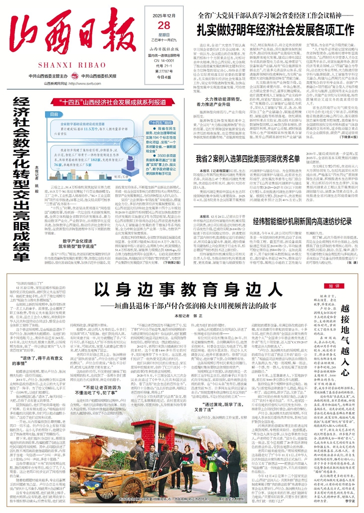 今年12月4日是第十二個國家憲法日,山西省“法潤人心 共筑和諧”普法責任制成果展示暨“我的普法故事”先進事跡分享會在太原舉行,盧付合、張潤棉夫婦上臺作了分享。談起未來的打算,他們鏗鏘有力地說:“只要有好故事,只要鄉(xiāng)親們喜歡看,我們就一直拍下去!”(記者 郭 正)