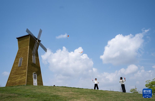 4月6日,在成都西湖公園,兩個(gè)小朋友在草地上放風(fēng)箏。(新華社記者 江宏景 攝)