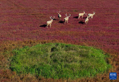 這是2024年10月29日在鹽城市東臺條子泥濕地拍攝的麋鹿(無人機照片)。(新華社記者 李博 攝)