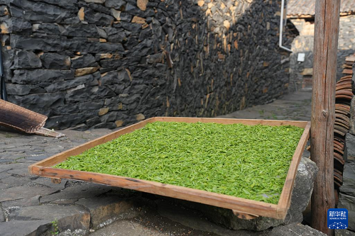 這是在磐安縣尖山鎮(zhèn)烏石村古民居間晾曬的茶青(4月10日攝)。(新華社記者 翁忻旸 攝)