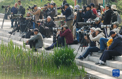 4月10日,攝影愛好者在北京玉淵潭公園架起“長槍大炮”拍攝湖面鳥禽。(新華社記者 張玉薇 攝)