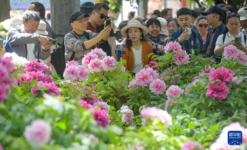 4月13日,游客在河南省洛陽市中國國花園內(nèi)賞牡丹花。(新華社發(fā) 張怡熙 攝)
