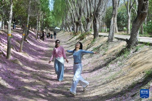 4月13日,游客在河南省商丘市夏邑縣櫻花園游玩。(新華社發(fā) 苗育才 攝)