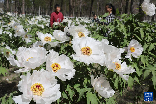 4月13日,游客在河南省焦作市溫縣國有實(shí)驗(yàn)林場芍藥花海中賞花拍照。(新華社發(fā) 徐宏星 攝)