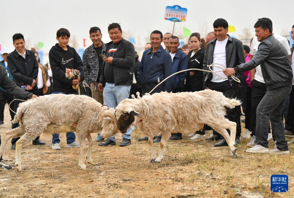 4月12日,人們在新疆于田縣先拜巴扎鎮(zhèn)農(nóng)牧民運動場觀看斗羊比賽。(新華社記者 胡虎虎 攝)