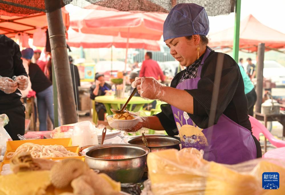 4月13日,一位商販在新疆于田縣先拜巴扎鎮(zhèn)農(nóng)牧民運動場為顧客制作面食。(新華社記者 胡虎虎 攝)
