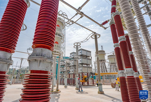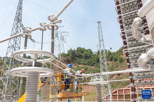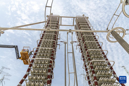 4月16日,安徽送變電工程有限公司施工人員在“疆電入渝”特高壓工程渝北換流站建設(shè)現(xiàn)場對(duì)電容器塔設(shè)備進(jìn)行調(diào)試驗(yàn)收。(新華社記者 黃偉 攝)