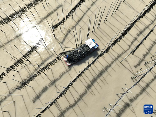 4月15日,福建省霞浦縣沙江鎮(zhèn)海域海帶養(yǎng)殖戶在收獲晾曬后的海帶(無(wú)人機(jī)照片)。(新華社記者 姜克紅 攝)