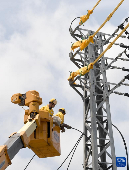 4月17日,在海南省陵水黎族自治縣華電陵水59.9MW分布式光伏發(fā)電項目現(xiàn)場,電力工作人員進行帶電接火作業(yè)。(新華社記者 趙穎全 攝)