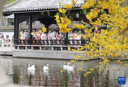 3月29日,在山東省臨沂市王羲之故居,身著傳統(tǒng)服裝的女子參加迎接“三月三”的活動。(新華社發(fā) 許傳寶 攝)