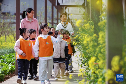 3月31日,農(nóng)歷三月初三,在河南省焦作市博愛縣九街社區(qū),幼兒園的教師帶領(lǐng)小朋友踏青賞花。(新華社發(fā) 程全 攝)