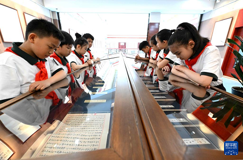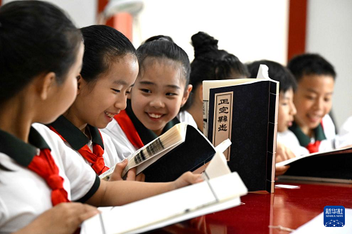 4月21日,石家莊市實驗小學學生在石家莊市圖書館古籍修復室翻閱現(xiàn)代線裝書并交流學習體會。(新華社發(fā) 陳其保 攝)
