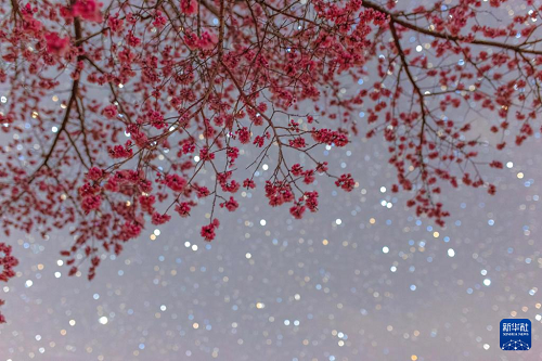 5月3日在黑龍江省佳木斯市杏林湖公園拍攝的含苞待放的榆葉梅與北斗七星。新華社發(fā)( 陳志國 攝)