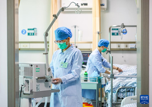 5月12日,在江蘇省揚(yáng)州市江都中醫(yī)院康復(fù)科,護(hù)士為患者調(diào)節(jié)呼吸機(jī)。(新華社發(fā) 任飛 攝)
