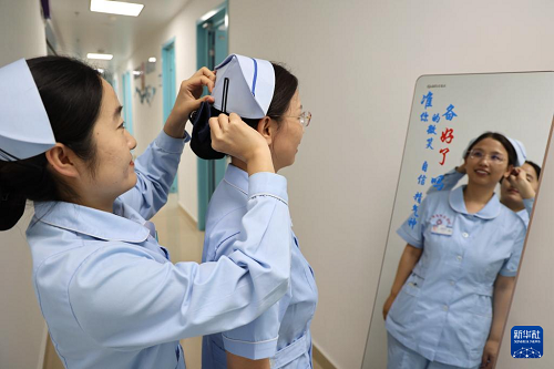 5月12日,山東省濱州市陽(yáng)信縣中醫(yī)醫(yī)院心內(nèi)科的護(hù)士在互相整理護(hù)士帽。(新華社發(fā) 初寶瑞 攝)