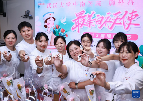 5月12日,武漢大學(xué)中南醫(yī)院胸外科護(hù)士展示護(hù)士節(jié)紀(jì)念章。(新華社發(fā) 趙軍 攝)