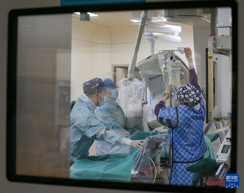 5月12日,在江蘇省句容市人民醫(yī)院介入手術(shù)室,醫(yī)護(hù)人員在進(jìn)行冠狀動(dòng)脈支架植入術(shù)。(新華社發(fā) 鐘學(xué)滿 攝)