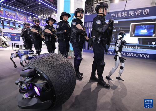 5月14日,在第十二屆中國國際警用裝備博覽會移民管理裝備展區(qū),民警和球形機器人、警用機器狗和具身人形智能警務機器人(右一)一起進行巡邏演練。(新華社記者 殷剛 攝)