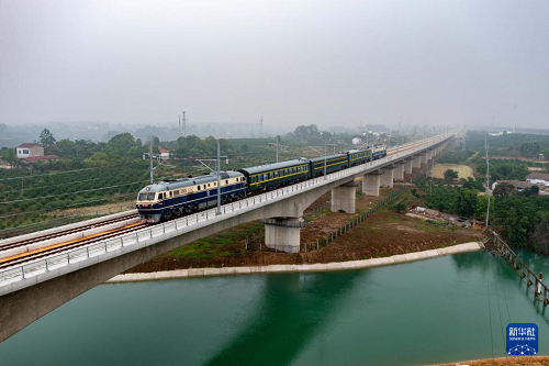 5月15日,55103次檢測(cè)列車在對(duì)滬渝蓉高鐵武宜段進(jìn)行綜合測(cè)試(無(wú)人機(jī)照片)。(新華社發(fā) 李垚駿 攝)
