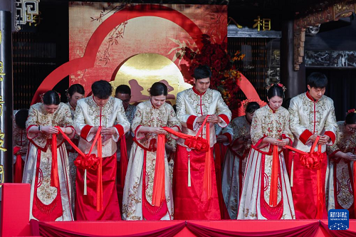 5月20日,新人們在諸暨市西施故里景區(qū)內參加集體婚禮的合巹禮儀式。(新華社記者 徐昱 攝)