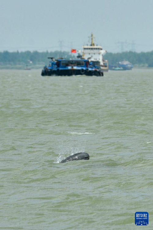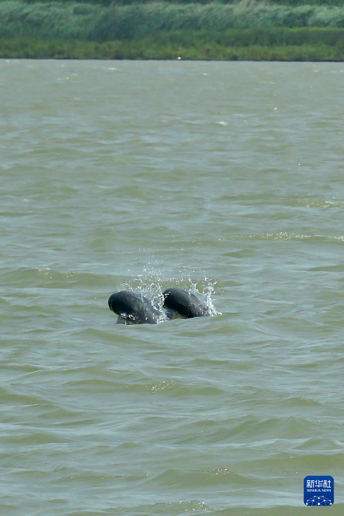 5月21日,在長(zhǎng)江銅陵段的江面上,野生江豚躍出水面。(新華社發(fā) 儲(chǔ)著傳 攝)