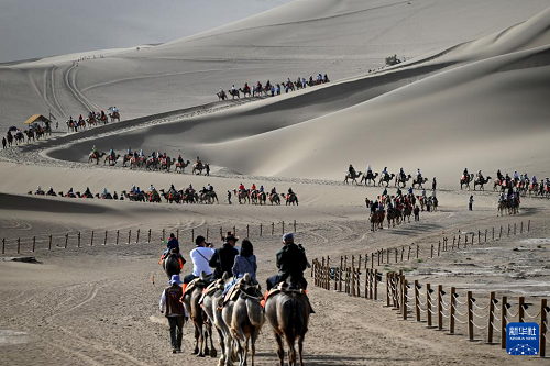6月2日,游客在甘肅省敦煌市鳴沙山月牙泉景區(qū)游覽。(新華社發(fā) 張曉亮 攝)