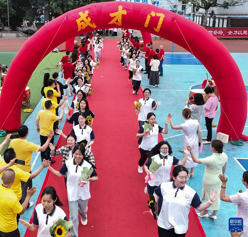 6月3日,在重慶市永川區(qū),萱花中學高三學子在教師的祝福聲中,依次邁入“成長門、成才門、成功門”。(新華社發(fā) 陳仕川 攝)