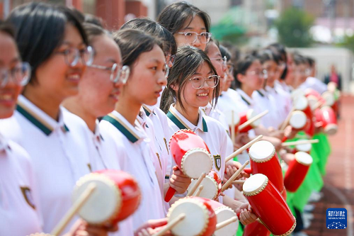 6月3日,在江蘇省海安市實驗中學,高一女子花鼓社團的同學們在為高三學長加油助威。(新華社發(fā) 顧彬斌 攝)