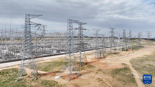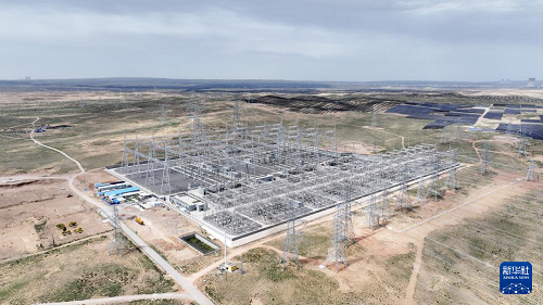 6月8日拍攝的寧國運靈武100萬千瓦光伏復(fù)合項目330千伏輸變電工程線路終點——北地750千伏變電站(無人機照片)。(新華社記者 王鵬 攝)