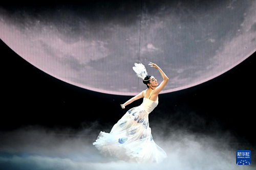 6月8日,中國殘疾人藝術(shù)團演員在甘肅敦煌大劇院表演大型情景音畫劇《千手千眼》。(新華社發(fā) 張曉亮 攝)