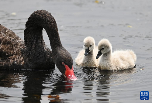 近日,在山東滕州微山湖紅荷濕地景區(qū),一對黑天鵝夫婦喜添新丁,自然繁殖的五只天鵝寶寶緊隨親鳥在水中游弋覓食。