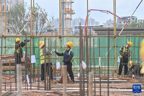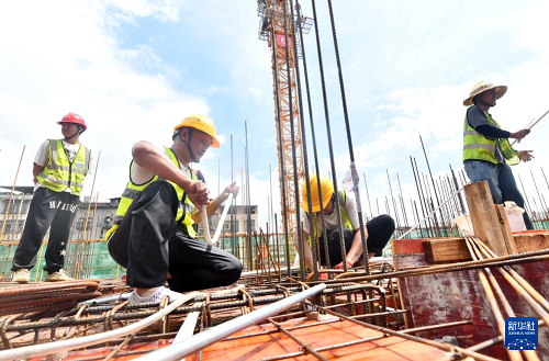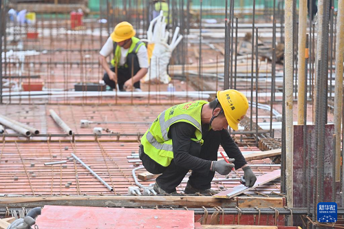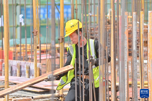 6月16日,中鐵二十局工人在南寧市雞村城中村改造項目建設(shè)現(xiàn)場施工作業(yè)。(新華社記者 黃孝邦 攝)