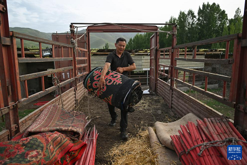 轉(zhuǎn)場第一天,在新源縣那拉提鎮(zhèn)塔依阿蘇村,巴拉提江在家中小院內(nèi)把毛毯搬上貨車(6月10日攝)。(新華社記者 胡虎虎 攝)