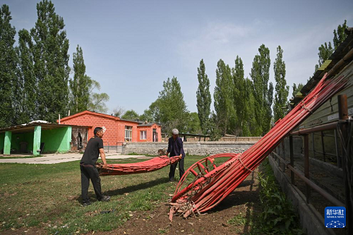 ?轉(zhuǎn)場第一天,在新源縣那拉提鎮(zhèn)塔依阿蘇村,巴拉提江(左)和鄰居一起抬著氈房結(jié)構(gòu)部件走在家中小院內(nèi)(6月10日攝)。(新華社記者 胡虎虎 攝)