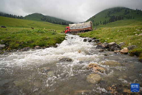 轉(zhuǎn)場第二天,載著氈房等生活物資的貨車駛過一處涉水路段(6月11日攝)。(新華社記者 胡虎虎 攝)