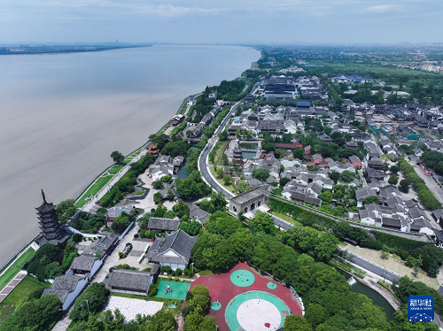 6月19日,空中俯瞰毗鄰錢塘江的鹽官古城潮樂之城(無人機照片)。(新華社記者 徐昱 攝)