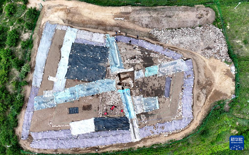6月18日,宣化鄭家溝遺址考古發(fā)掘項(xiàng)目隊(duì)員在一號(hào)積石冢工作(無(wú)人機(jī)照片)。(新華社記者 王曉 攝)