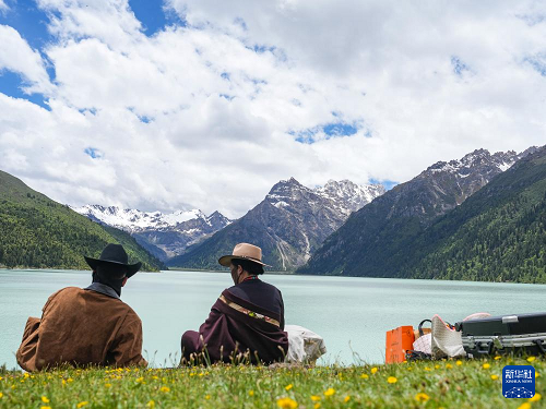 6月21日,游客在玉龍拉措觀光休閑。(新華社記者 王曦 攝)