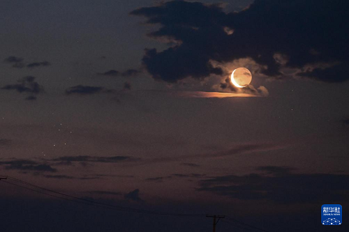 這是6月23日凌晨在黑龍江省齊齊哈爾市克欽湖拍攝的昴星團(tuán)伴月。(新華社發(fā) 王勇剛 攝)