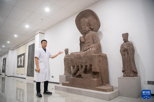 6月24日,在大足石刻文物醫(yī)院,工作人員對石質(zhì)文物進行修復并采集數(shù)字化信息。(新華社記者 唐奕 攝)