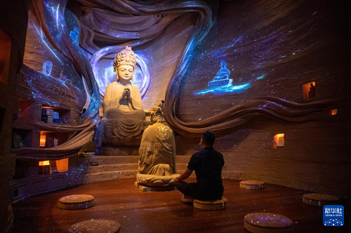 6月24日,游客在大足石刻景區(qū)一處數(shù)字化聲光場景中體驗。(新華社記者 唐奕 攝)